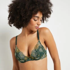 – découpe triangulaire rehaussée de satin et broderies derrière